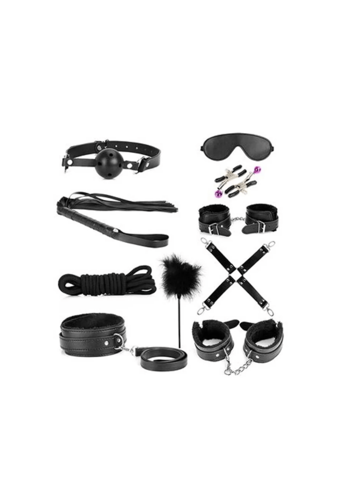 Este kit completo de 10 piezas incluye todo lo que necesitas para experimentar el placer de una forma segura y emocionante. Desde esposas hasta mordazas, cada pieza está hecha con materiales de calidad, asegurando comodidad y resistencia para momentos intensos.